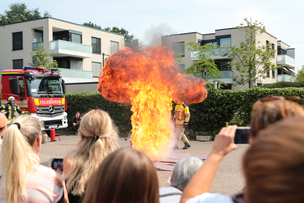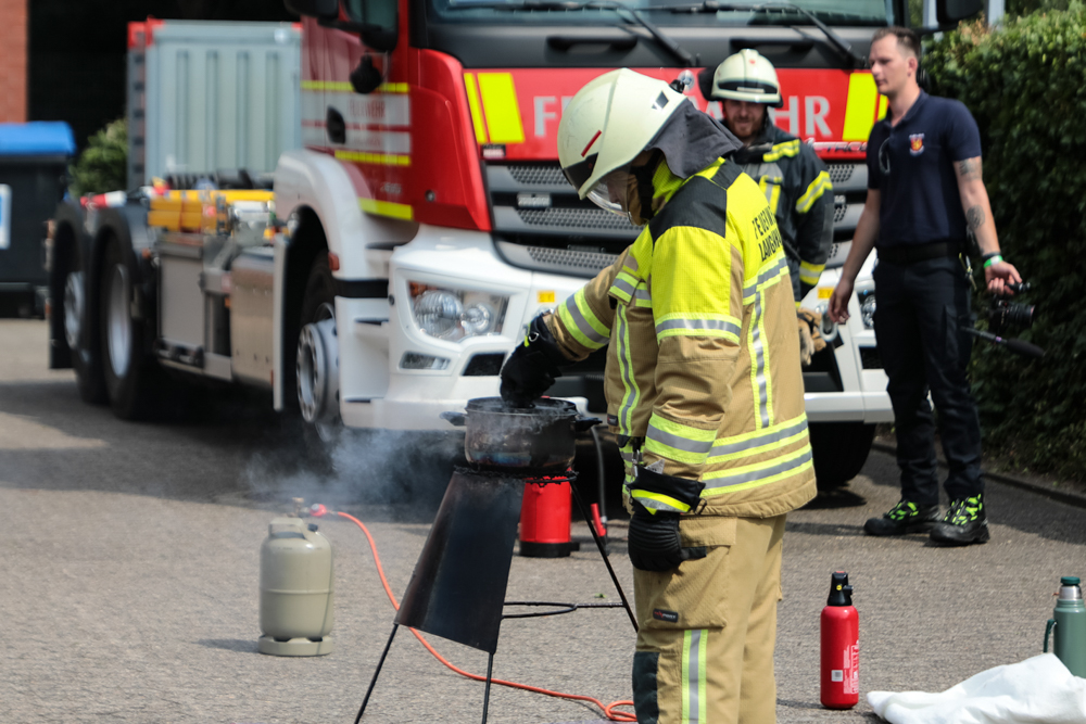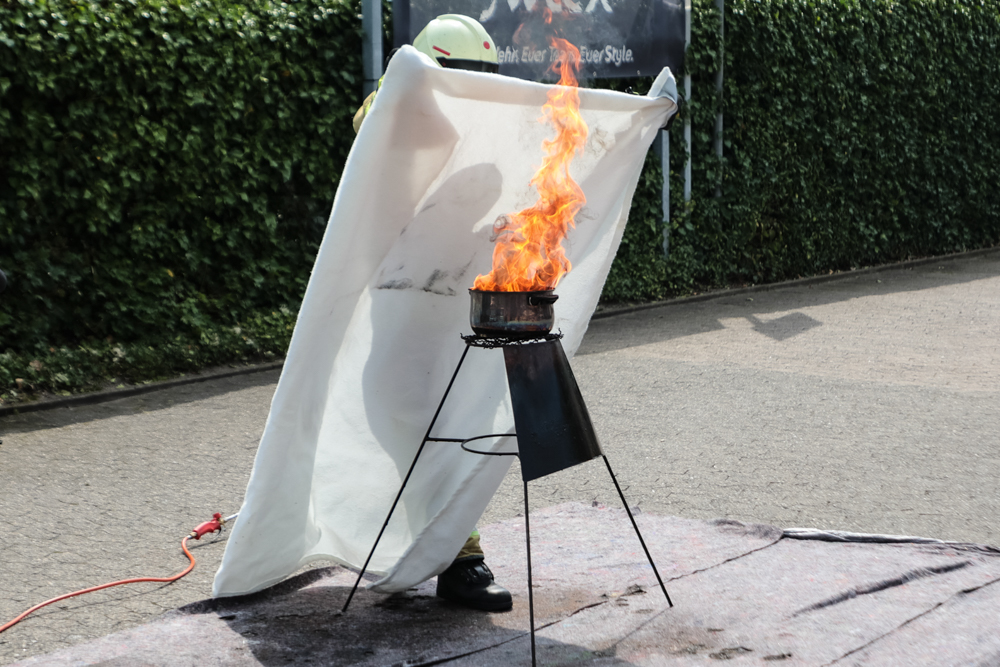 An dieser Stelle sei nochmal angemerkt: Bei einem Fettbrand sollte man niemals Wasser als Löschmittel nutzen, dies führt zu einer Fettexplosion, (Symbolbild 1-2). Es empfiehlt sich eine Löschdecke (Bild 4) oder einen Fettbrandlöscher (Bild 5-6) in der Nähe der Küche, für diese Fälle, bereit zu halten. Bei kleineren Fettbränden kann das Schließen des Kochtopfes mittels eines Deckels ausreichen (Bild 3). Zu dem sollte natürlich unverzüglich der Herd ausgeschaltet werden. Bei allen Maßnahmen gilt die eigene Sicherheit zu wahren und sich bei Löschversuchen nicht in Gefahr zu bringen.