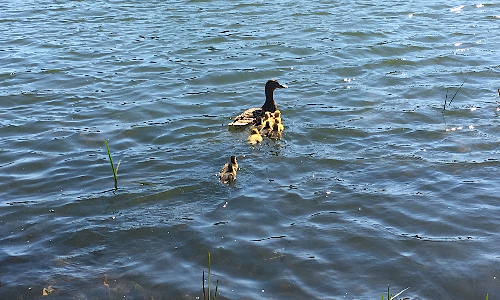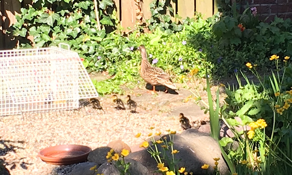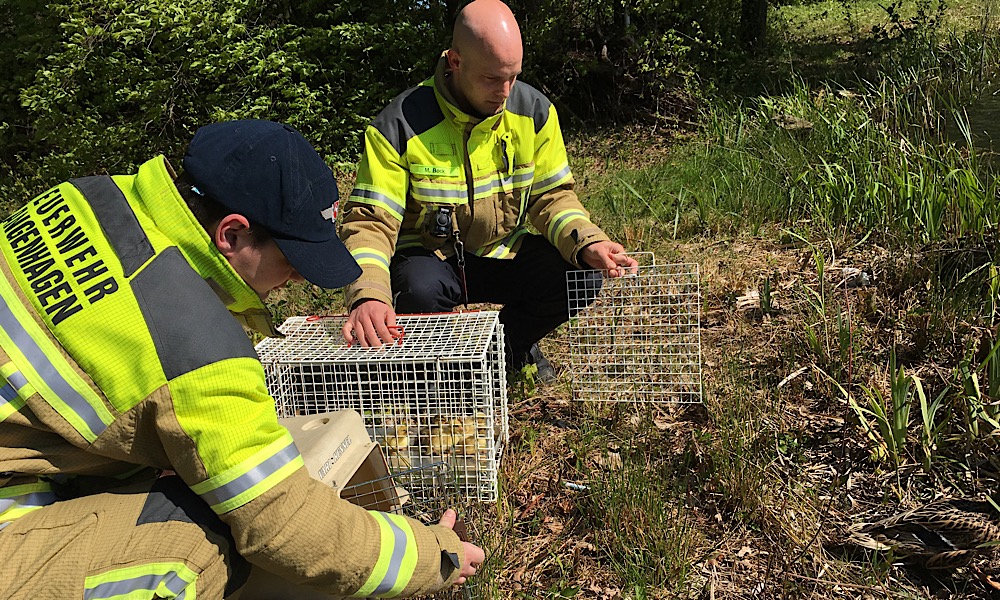 Eine Entenmutter hatte ihre 9 Kinder in einem eingezäunten Garten zur Welt gebracht, aus dem es kein Entkommen gab -> Entenfamilie eingefangen und im Freibad Waldsee wieder ausgesetzt