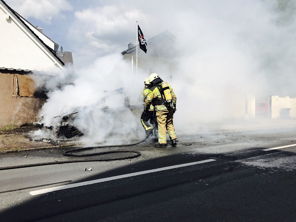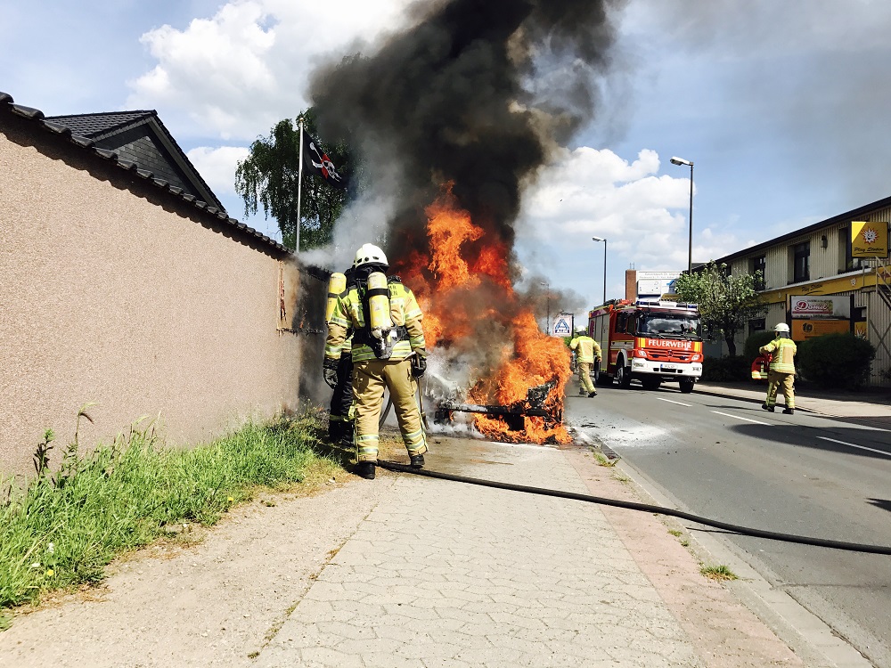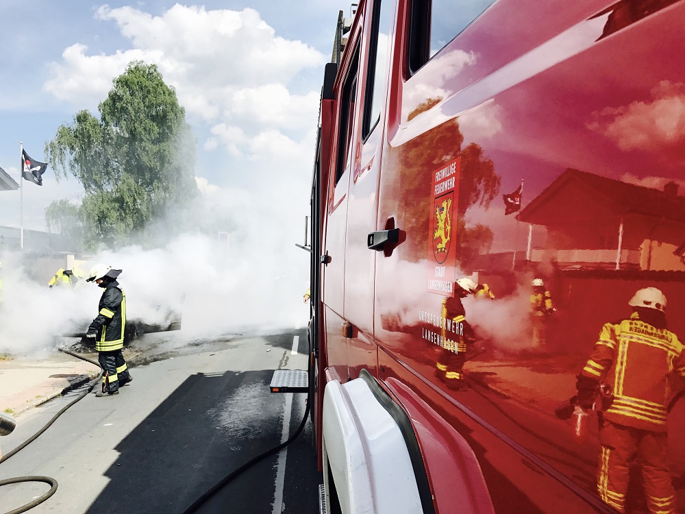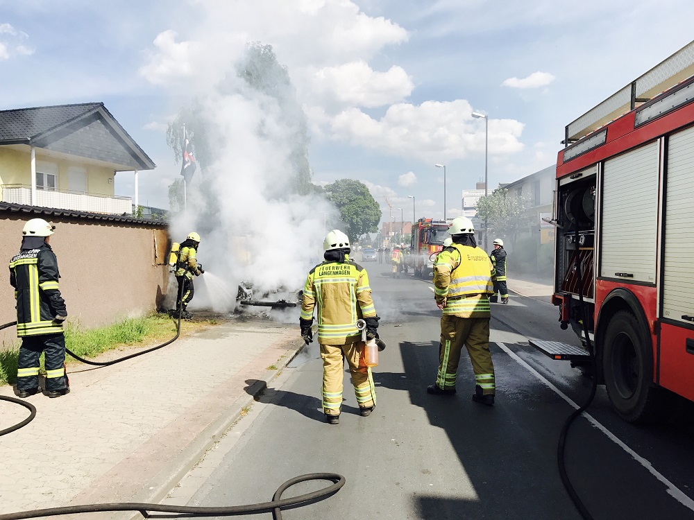 Mit dem Stichwort "PKW Brand" ist die Ortsfeuerwehr Langenhagen heute um 15.33 Uhr alarmiert worden. Einsatzleiter Karsten Patz rückte mit beiden Tanklöschfahrzeugen aus. Ein Mann war mit seinem Peugeot auf dem Pferdemarkt unterwegs, als sein Fahrzeug zu qualmen begann. Schnell rettete sich der Mann auf den Seitenstreifen, bevor die ersten Flammen aus dem Motorraum schlugen. Bei Eintreffen von Patz brannte der PKW in voller Ausdehnung. Das Feuer drohte auf die nahe gelegene Mauer bzw. das dahinterliegende Haus überzugreifen. Sofort ging ein Trupp unter Atemschutz mit einem C-Rohr vor um die Flammen nieder zu schlagen. Der Pferdemarkt war während der Löschmaßnahmen komplett gesperrt. Ingesamt waren die 12 eingesetzten Kräfte gut eine Stunde im Einsatz. Unter anderem kam die Stadtentwässerung zum Einsatz, da kontaminiertes Löschwasser in den Abwasserkanal gelang.