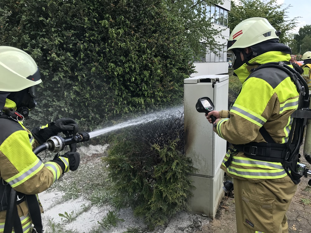 Zu einem Heckenbrand ist die Ortsfeuerwehr Langenhagen am Montagmittag in die Straße Mühlenfeld gerufen worden. Bei Arbeiten mit einem Gasbrenner auf dem Gehweg fing eine angrenzende Hecke Feuer. Einsatzleiter Lars Sill rückte mit dem Tanklöschfahrzeug und sechs Einsatzkräften aus. Vor Ort hatte man schon mittels Feuerlöscher und Eimern Wasser den Brand unter Kontrolle gebracht. Ein Trupp führte Nachlöscharbeiten durch und kontrollierte die Brandstelle mit der Wärmebildkamera. Durch das Feuer ist ein Stromverteilerkasten in Mitleidenschaft gezogen worden. Der zuständige Energieversorger wurde informiert.