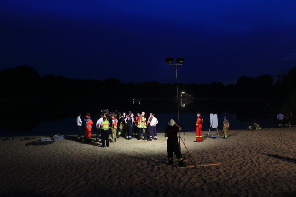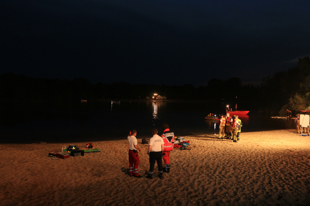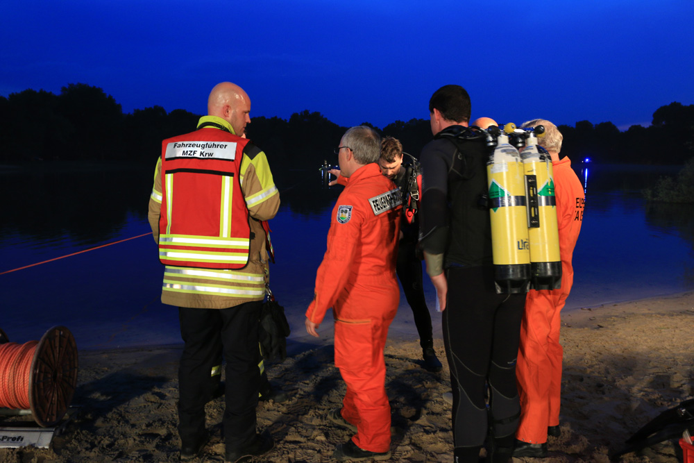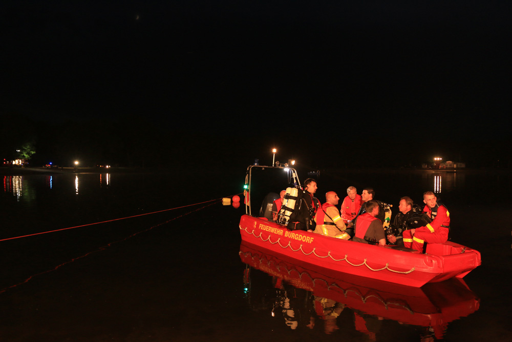 Im weiteren Verlauf wurde eine etwa 120 m lange Strecke zwischen dem östlichen Seeufer und einer Badeplattform, durch zwölf Taucher, abgesucht. Im ufernahen Abschnitt wurde darüber hinaus eine Kette aus Rettungsschwimmern gebildet. Auf Grund der Dunkelheit wurde der See weiträumig ausgeleuchtet - u.a. über die leistungsstarken Scheinwerfer der Drehleiter. Die Trübung des Wassers und die einsetzende Dunkelheit erschwerten die Suchmaßnahmen der Taucher.