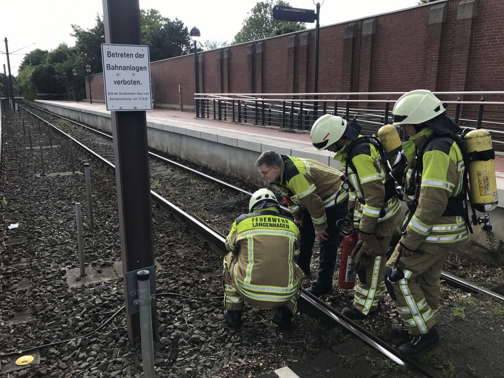 Die Ortsfeuerwehr Langenhagen wurde am Dienstagabend zu einem Kabelbrand an die Haltestelle Kurt-Schumacher-Straße der Stadtbahnlinie 1 gerufen. Bei jeder Durchfahrt einer Stadtbahn war eine Rauchentwicklung an einem Erdkabel zu beobachten. Einsatzleiter Oliver Schütte ließ die Stelle mit der Wärmebildkamera kontrollieren und konnte eine Hitze von über 150 Grad messen. Als weitere Massnahmen wurden der Brandschutz sichergestellt sowie der technische Dienst der Üstra alarmiert. Während der Erkundung sowie Reparaturarbeiten war die Stadtbahnstrecke für gut 45 Minuten gesperrt. Die Ortsfeuerwehr, die mit dem Tanklöschfahrzeug sowie sechs Kräften ausgerückt war, konnte die Einsatzstelle nach gut einer halben Stunde wieder verlassen.