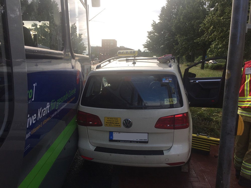 Am frühen Montagmorgen wurde die Ortsfeuerwehr Langenhagen zu einem Unfall am Stadtbahnhof Zentrum gerufen. Dort kam es zu einem Zusammenstoß der Stadtbahn mit einem PKW. Aus noch unbekannten Gründen kollidierte das von der Bothfelder Straße abbiegende Taxi mit der aus Fahrtrichtung Hannover kommenden Straßenbahn. Bei dem Aufprall wurde der PKW ein paar Meter mitgezogen, beide Insassen konnten sich nicht eigenständig aus dem Fahrzeug befreien. Einsatzleiter Christopher Klein rückte mit dem Hilfeleistungszug, bestehend aus Rüstwagen, Hilfeleistungstanklöschfahrzeug und Einsatzleitwagen sowie 12 Kräften, aus. Der Taxifahrer und sein älterer Fahrgast wurden bereits von Rettungsdienst betreut. Klein ließ Schere und Spreizer als Rettungsgeräte vornehmen um die deformierten Türen zu öffnen. Die beiden Insassen konnten so zügig befreit und an den Rettungsdienst übergeben werden. Mit leichten Verletzungen wurden beide in umliegende Krankenhäuser gebracht. Die Batterie des PKW wurde sicherheitshalber abgeklemmt. Nach 45 Minuten konnte die ehrenamtlichen Kräfte die Einsatzstelle verlassen.