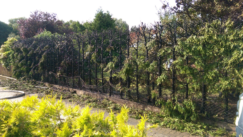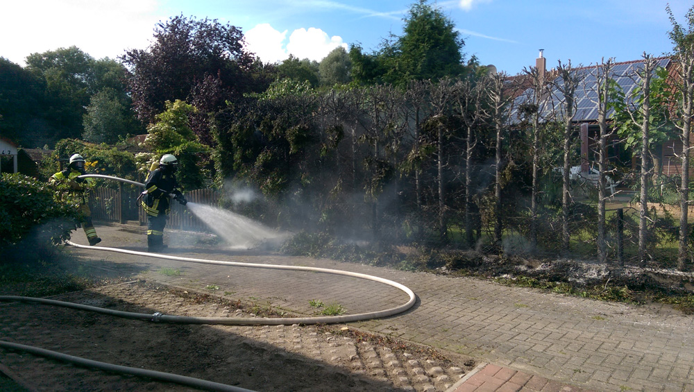 Anwohner bemerkten am Mittwochnachmittag den Brand einer Hecke und alarmierten die Feuerwehr. Bis zum Eintreffen der zuständigen Ortsfeuerwehr wurden einige Nachbarn auf den Brand aufmerksam. Mit Gartenschläuchen und einer Eimerkette wurde versucht, ein Ausbreiten der Flammen auf das anliegende Wohnhaus zu verhindern.