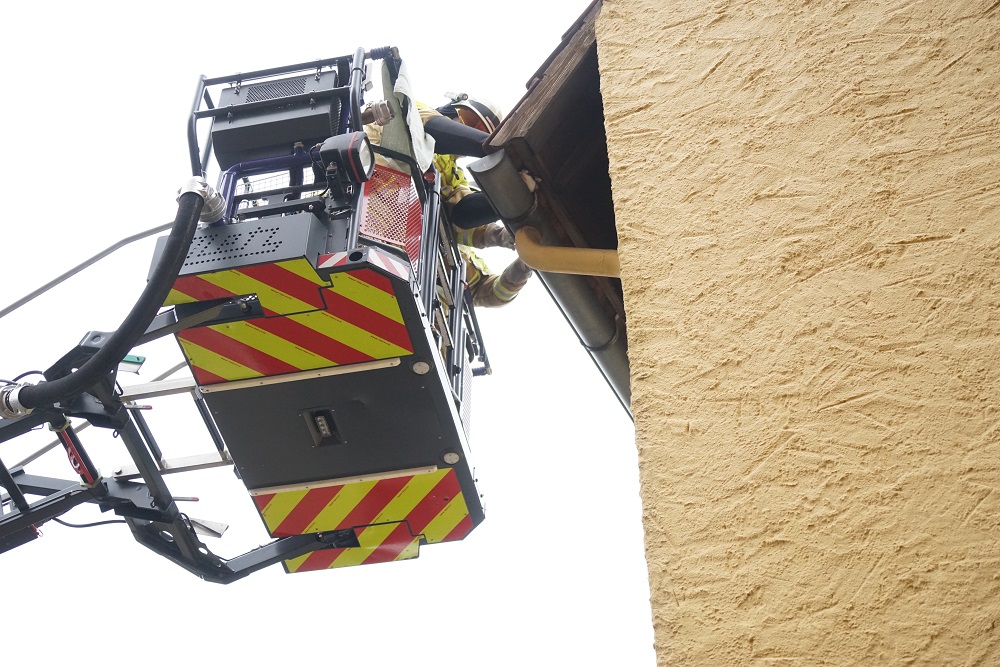 Passanten bemerkten am Donnerstagmorgen an der Kreuzung Walsroder- und Konrad-Adenauer-Straße ein Jaulen eines Tieres. Dabei stellte sich heraus, dass sich eine kleine Katze an der Dachrinne im 3. Obergeschoss eingeklemmt hatte und sich selbst nicht aus der misslichen Lage befreien konnte. Die Ortsfeuerwehren Krähenwinkel und Langenhagen wurden zur Tierrettung um 8.43 Uhr alarmiert. Nach der Lageerkundung durch Langenhagens Zugführer Marcel Hofmann sowie Krähenwinkels Ortsbrandmeister Kai Jüttner wurde sofort das Drehleiterfahrzeug aus der nur ein paar Meter entfernten Wache Langenhagen hinzugezogen. Über den Korb konnte die Katze daraufhin von einem Kameraden gerettet und dem glücklichen Besitzer übergeben werden.