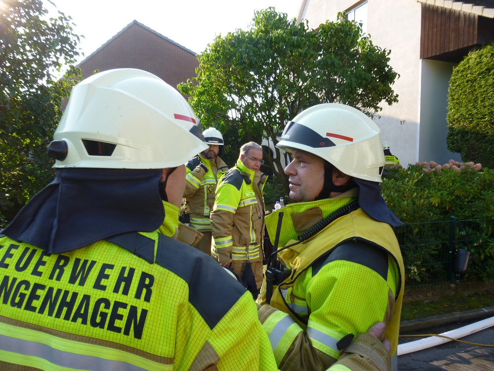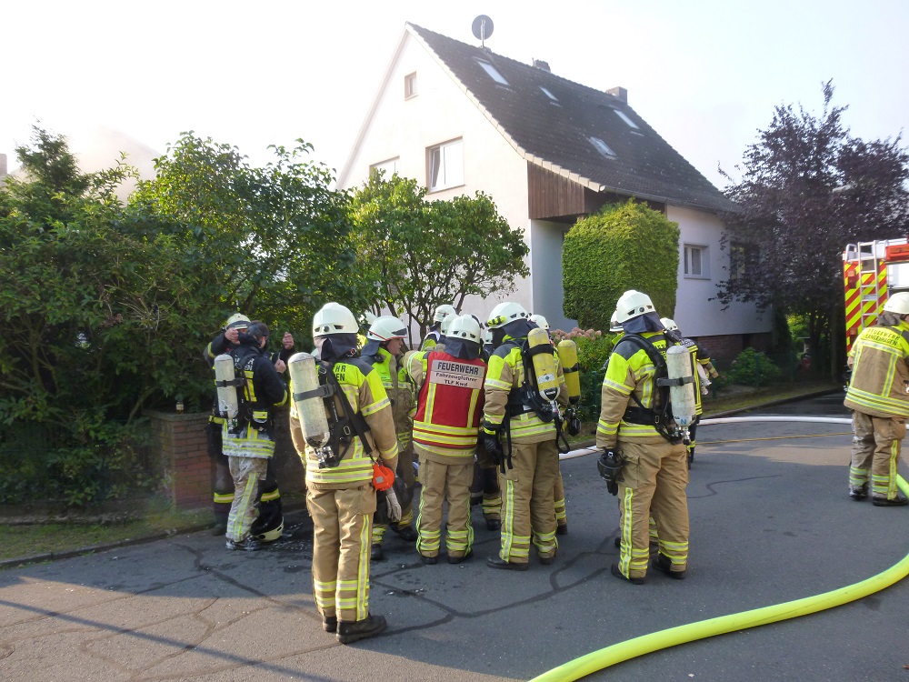 Schreyer ließ sofort einen Trupp in den Keller vorgehen. Dort herrschten zu dem Zeitpunkt Temperaturen von 800 bis 1000 Grad Celsius. Über zwei Zugangswege arbeiteten sich die Atemschutztrupps vor und kühlten Rauchgase und Brandgut herunter. Im weiteren Verlauf des Einsatzes entschied sich die Einsatzleitung bestehend aus Einsatzleiter Schreyer, Ortsbrandmeister Jens Heindorf sowie den beiden stellvertretenden Stadtbrandmeistern Thomas Ajrumow und Oliver Schütte Schaum vorzunehmen und den Brand im Keller zu ersticken. Laut Aussage der Eigentümer soll sich ein Saunabereich im Keller befinden, welcher eine erhöhte Brandlast darstellt. Gegen 9:00 Uhr konnte "Feuer aus" gemeldet werden. Insgesamt wurden sechs Atemschutztrupp bis zu dem Zeitpunkt eingesetzt. Die Feuerwehr ist mit über 50 Kräften und 12 Fahrzeugen vor Ort.