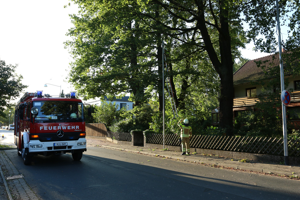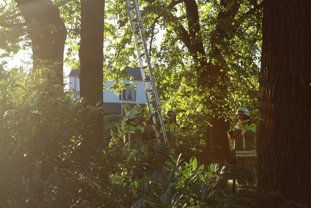 Durch den Sturm löste sich ein Ast in ca. zehn Meter Höhe. Mit einer Steckleiter wurde sich Zugang zum abgebrochenen Ast verschafft und dieser sicher zu Boden gebracht. Im Einsatz waren elf Einsatzkräfte.