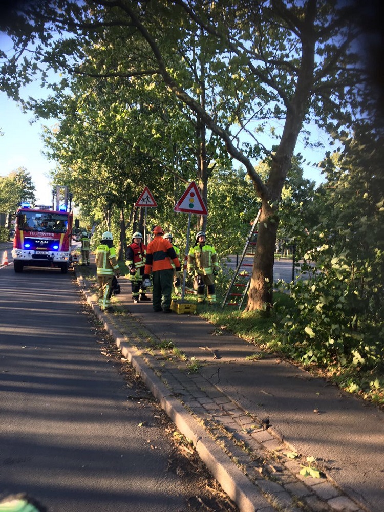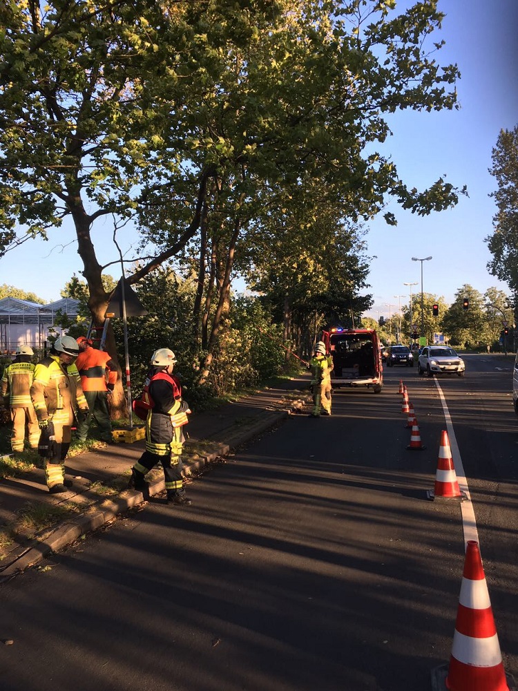 Ein Ast drohte auf die Hannoversche Str. zu stürzen. Der Ast wurde abgesägt und die Fahrbahn gereinigt.