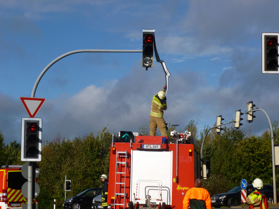 Schief stehende Ampel wieder in Normalposition gedreht und eine lose Verkleidung entfernt.