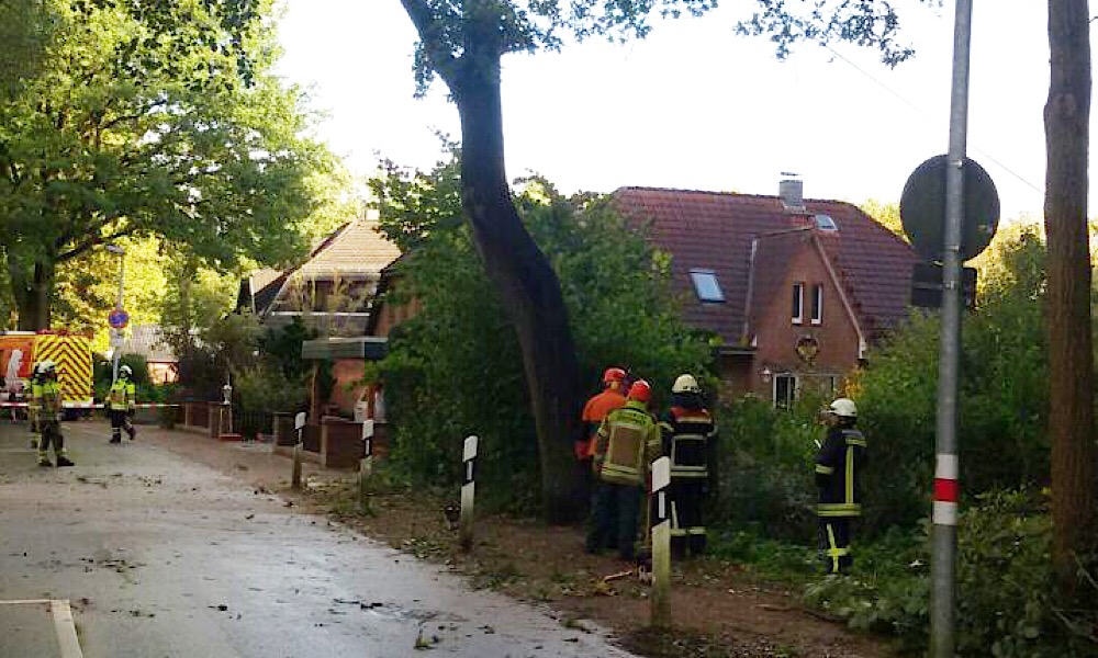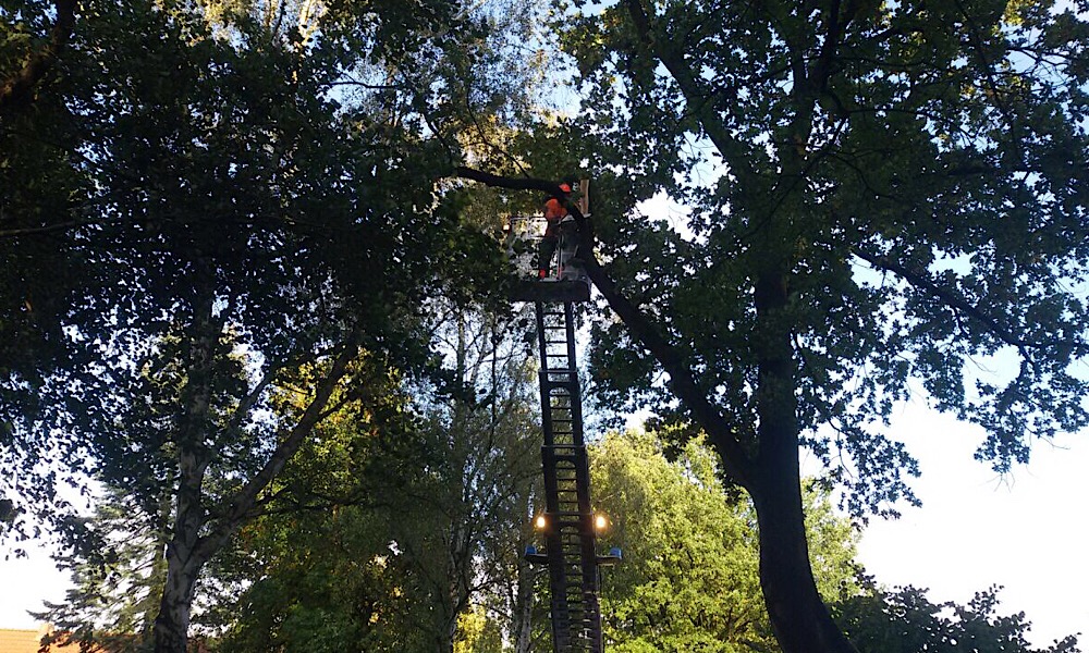 Der Wurzelteller einer 20m hohen und 80cm dicken Eiche hatte sich merklich aus dem Erdreich gehoben. Da der Baum an einer stark befahrenen Straße stand, bestand Gefahr für die öffentliche Sicherheit! Aus dem Korb der Drehleiter wurden zuerst größere Äste aus der Krone entfernt, da der Platz für eine kontrollierte Fällung beengt war.