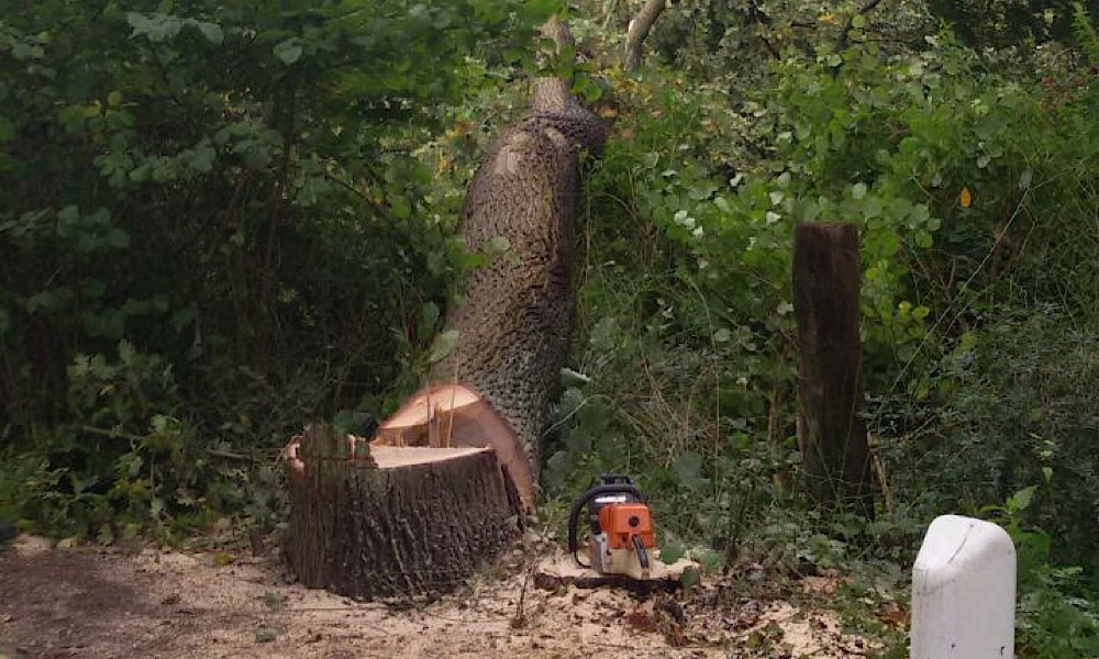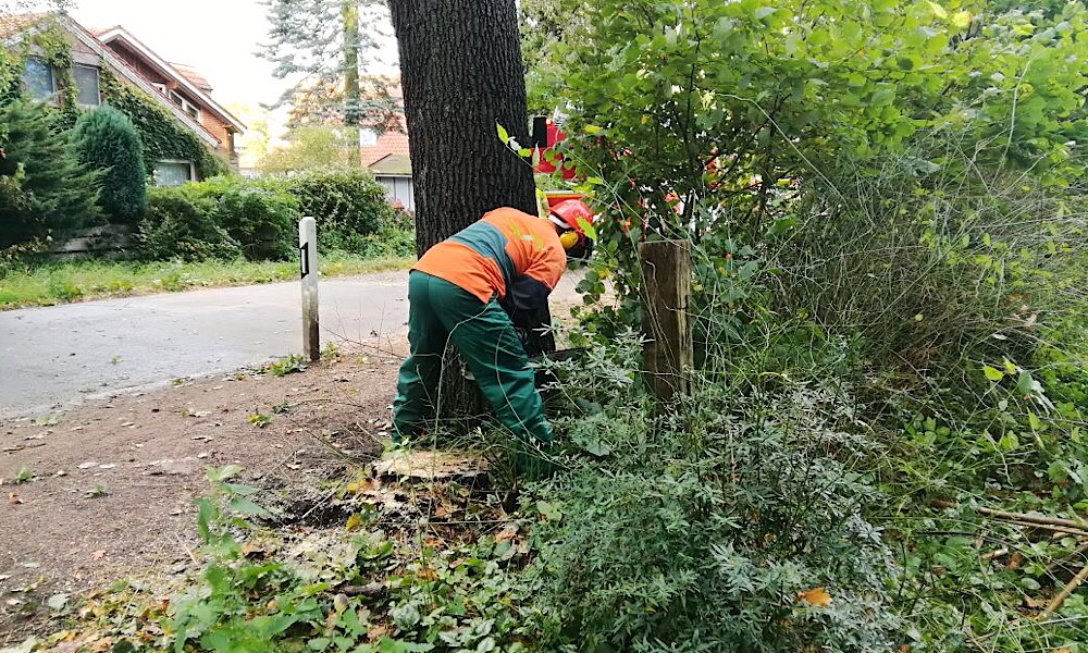 Ein Zugseil wurde von der Baumkrone zu einem Trecker gespannt, um während der anschließenden Fällarbeiten ein vorzeitiges, unkontrolliertes Kippen zu verhindern. Eine Fallkerbanlage konnte nun für die kontrollierte Fällung vorbereitet werden.
