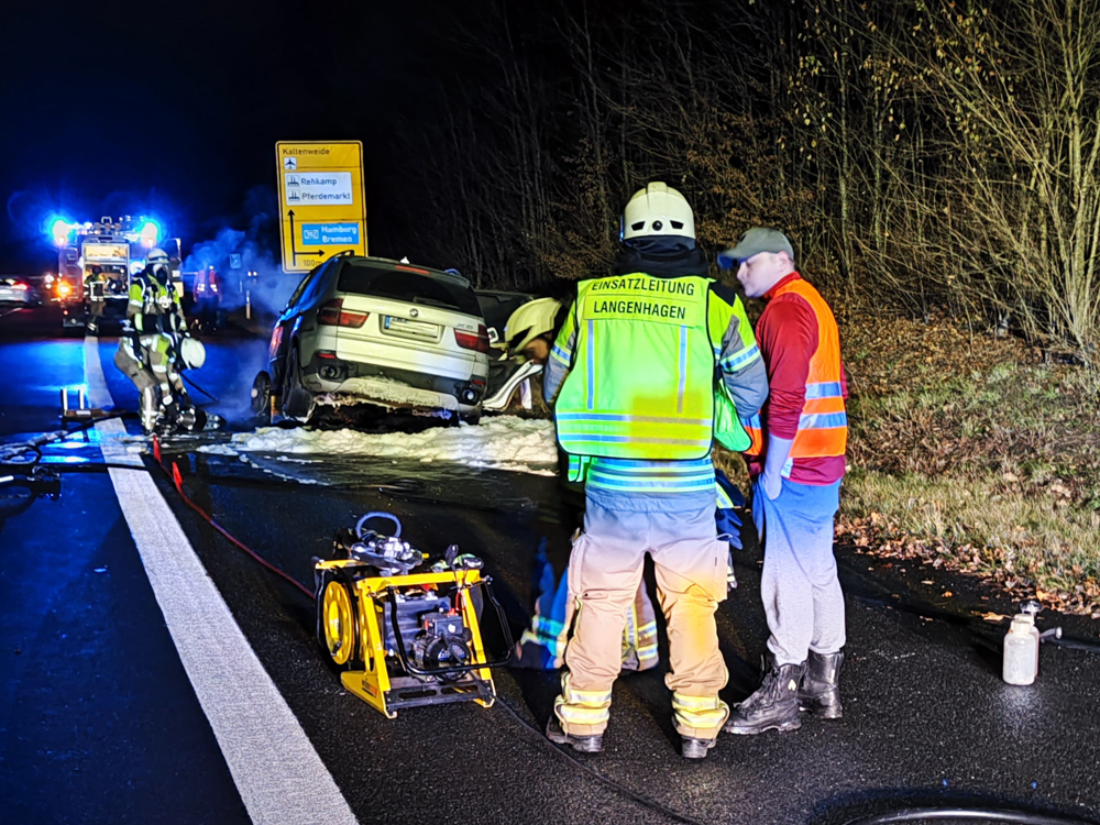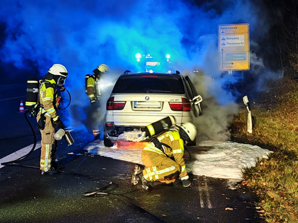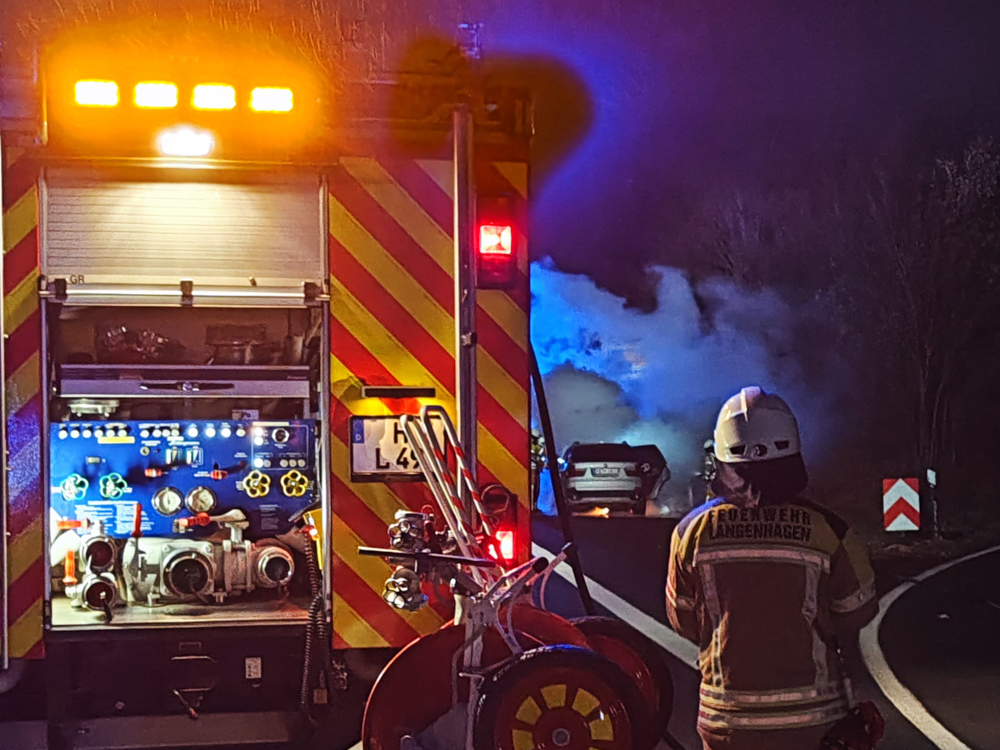 In der vergangenen Nacht gegen 5:35 wurden die ehrenamtlichen Einsatzkräfte der Ortsfeuerwehr Langenhagen zu einem PKW Brand alarmiert. Beim Eintreffen stand ein PKW auf dem Seitenstreifen der B522 im Vollbrand. Die Polizei sperrte daraufhin kurzfristig die Schnellstraße, so dass die beiden Angriffstrupps sicher unter Atemschutz vorgehen konnte. Das Fahrzeug wurde mittels zweier Schnellangriffsschläuche abgelöscht. Der Schnellangriff, auch S-Rohr genannt, ist ein schon an der Pumpe angeschlossener, meist formstabiler Schlauch, inklusive Strahlrohr, der somit schnell einsatzbereit ist.