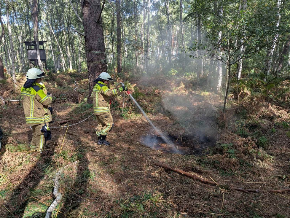 In der Nähe des Aussichtsturm im Kaltenweider Moor meldeten Spaziergänger eine Rauchentwicklung. Vor Ort hatten offenbar unbekannte Personen im Wald genächtigt und ein Lagerfeuer nicht ausreichend gelöscht. Das Feuer hatte sich in die Tiefe des Torfbodens gefressen und schwelte dort weiter. Von den Einsatzkräften wurde der Boden mit Spaten und Schaufeln aufgenommen und der Untergrund umfassend gewässert. Unter der Einsatzleitung von Ralf Dankenbring waren 14 Einsatzkräfte mit 3 Fahrzeugen vor Or...