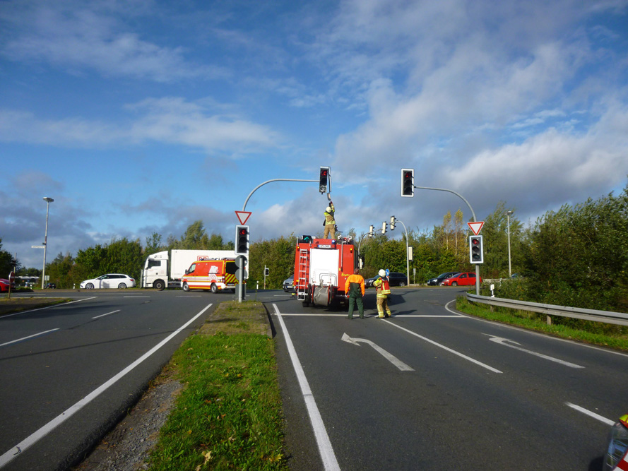 Schief stehende Ampel wieder in Normalposition gedreht und eine lose Verkleidung entfernt.