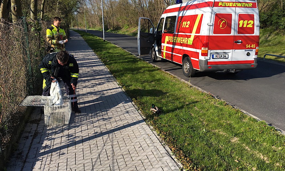 Ente mit gebrochenem Flügel im Grünstreifen -> Transport in die Tierärztliche Hochschule