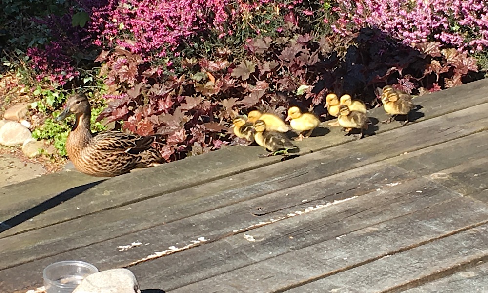 Eine Entenmutter hatte ihre 9 Kinder in einem eingezäunten Garten zur Welt gebracht, aus dem es kein Entkommen gab -> Entenfamilie eingefangen und im Freibad Waldsee wieder ausgesetzt