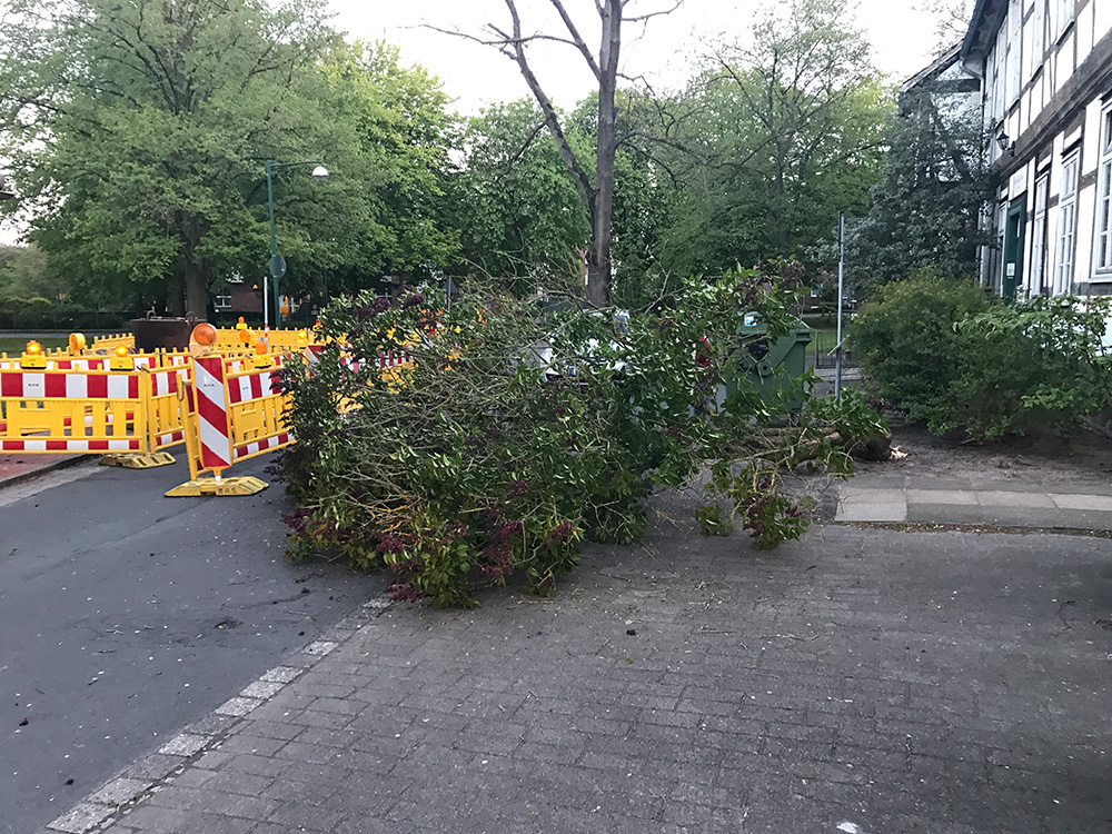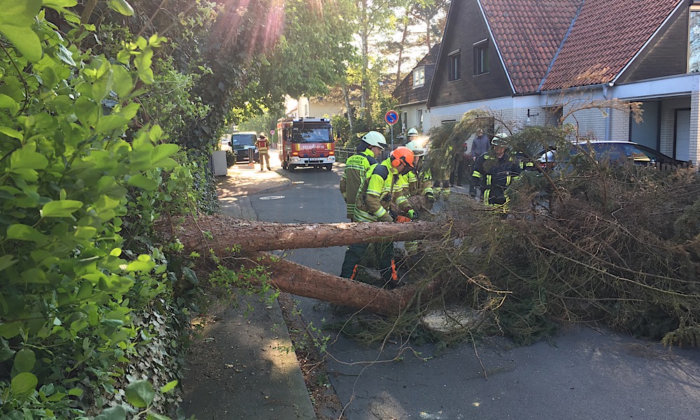 Baum von Privatgrundstück auf Straße gefallen, durch Feuerwehr beiseite gezogen.