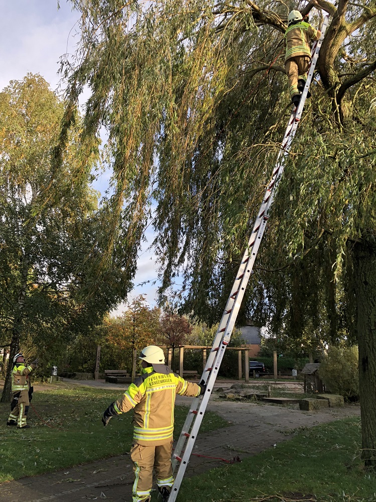 Ein Ast drohte auf einen Geh- und Radweg zu fallen. Dieser wurde über Steckleiter mithilfe einer Bügelsäge entfernt.