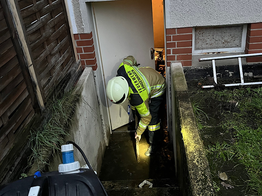 Wasser im Keller und Kellerabgang. Das Wasser im Kellerabgang wurde abgepumpt und die Tür mit sechs Sandsäcken abgedichtet.