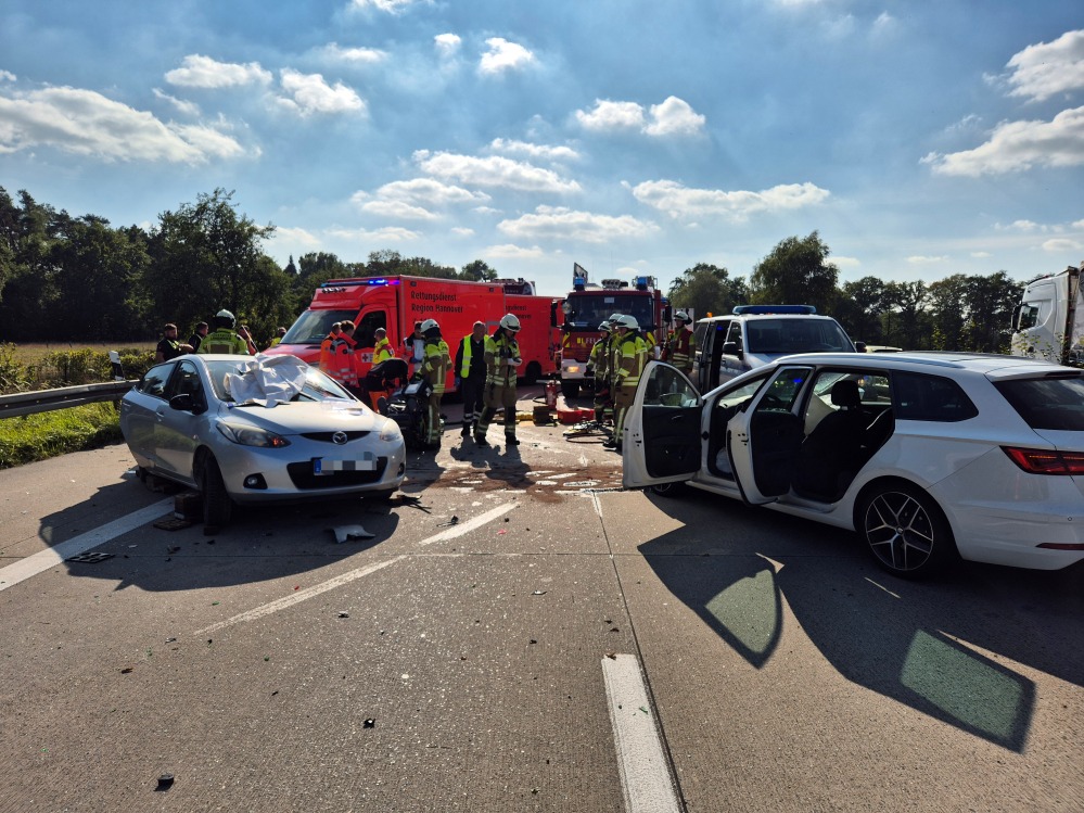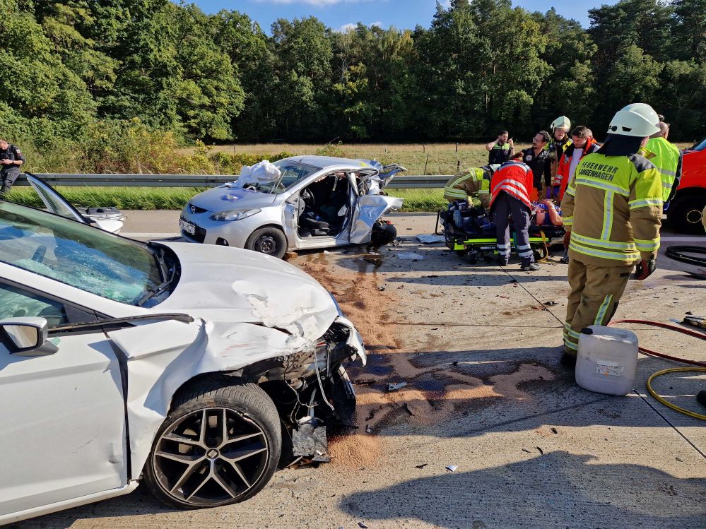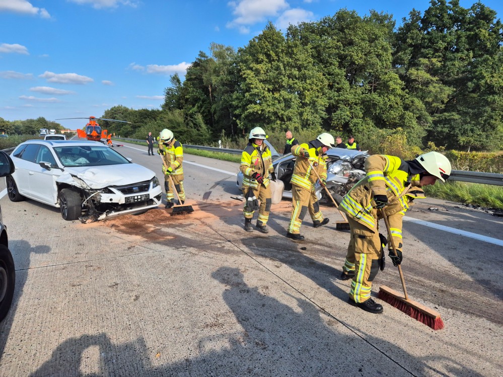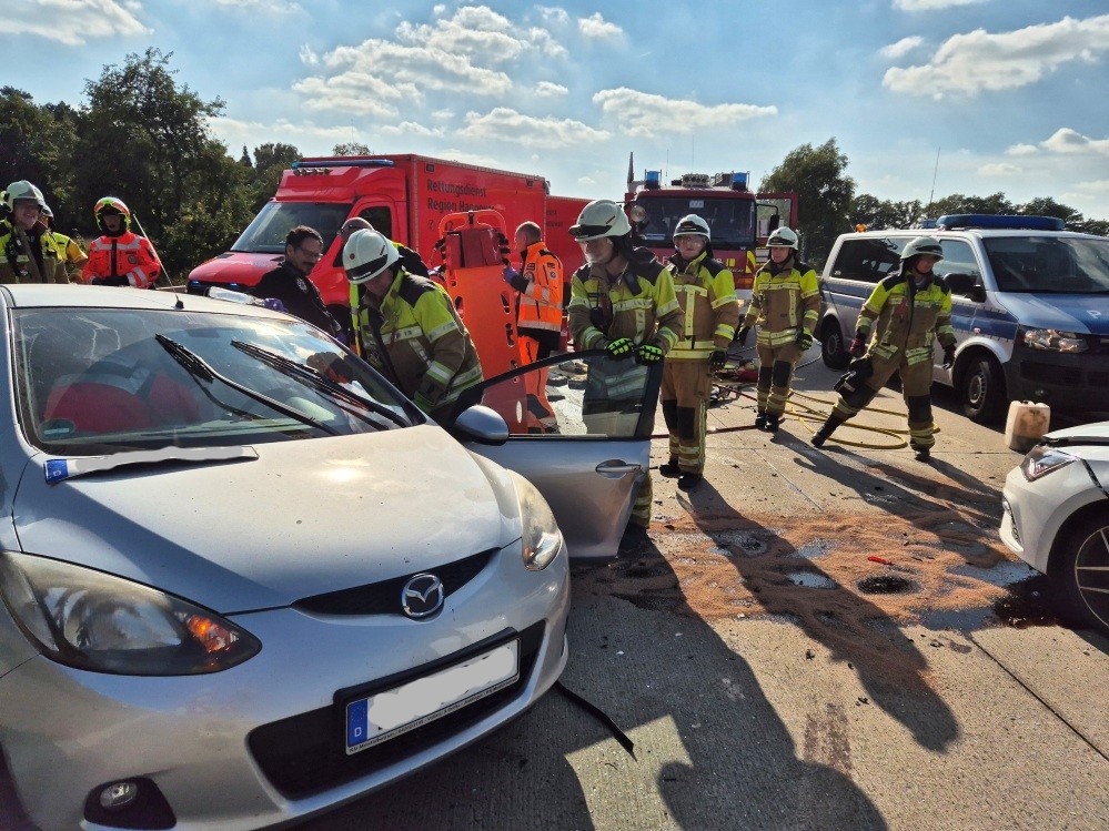 Zu einem Verkehrsunfall wurden die Feuerwehren Kaltenweide und Langenhagen am Donnerstagmittag um 14:15 Uhr auf die A 352 Fahrtrichtung Nord alarmiert. Der 34-jährige Fahrer eines Seats Leon ist in das Heck eines Mazda 2 geprallt. Bei Eintreffen der Feuerwehr war der 56-jährige Mazdafahrer in seinem Fahrzeug eingeschlossen. Der Seatfahrer konnte sein Fahrzeug eigenständig verlassen und wurde bereits durch den Rettungsdienst versorgt. Durch die Feuerwehr wurde die Fahrertür des Mazdas mittels hydraulischem Rettungsgerät entfernt. Anschließend konnte der Fahrer mit einem Spineboard aus dem PKW gerettet und an den Rettungsdienst übergeben werden. Er wurde mit dem Rettungshubschrauber Christoph 4 in ein Krankenhaus geflogen. Anschließend wurden auslaufende Betriebsstoffe mit Bindemittel abgestreut. Für die Dauer des Einsatzes wurde die A 352 in Fahrtrichtung Hamburg voll gesperrt, es kam zu erheblichen Verkehrbehinderungen. Unter der Einsatzleitung von Tobias Seifert waren 21 Einsatzkräfte mit 7 Fahrzeugen sowie der Rettungsdienst und die Polizei vor Ort.