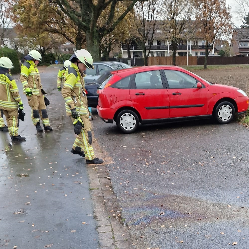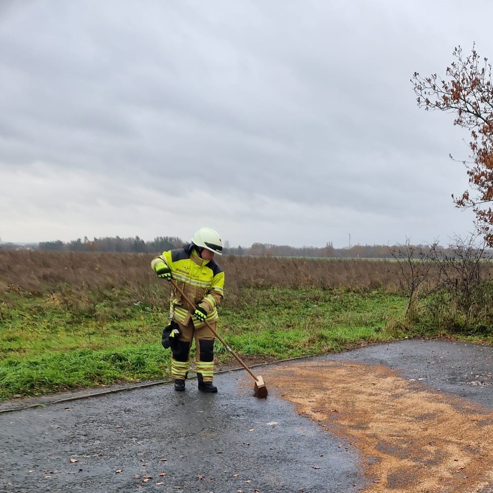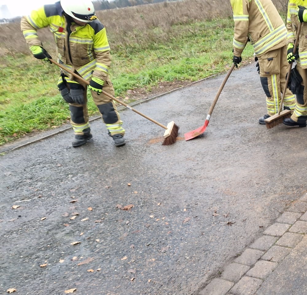 Unter der Leitung von Florian Kahle wurde Ölbindemittel auf die Ölspur aufgebracht und der naheliegende Gulli eingedeicht. Nach dem kurzen Einwirken wurde das Bindemittel wieder abgetragen.