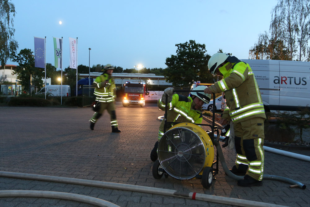 Regelmäßige Übungen haben deshalb einen hohen Stellenwert in der Ausbildung der Feuerwehren. Am Mittwochabend wurde die Ortsfeuerwehr Krähenwinkel zu einer vermeintlichen Rauchentwicklung in der Lagerhalle der Firma Artus alarmiert. Beim Eintreffen konnte Einsatzleiter Kai Jüttner diese bestätigen. Die Erkundung ergab einen vollumfänglichen Brand im Lagerbereich des Unternehmens. Weitere Einsatzkräfte - Ortsfeuerwehr Kaltenweide und die Drehleiter aus Langenhagen - wurden umgehend hinzugezogen. Im Folgenden wurden durch Jüttner ca. 100 Hände in den Einsatz gebracht: