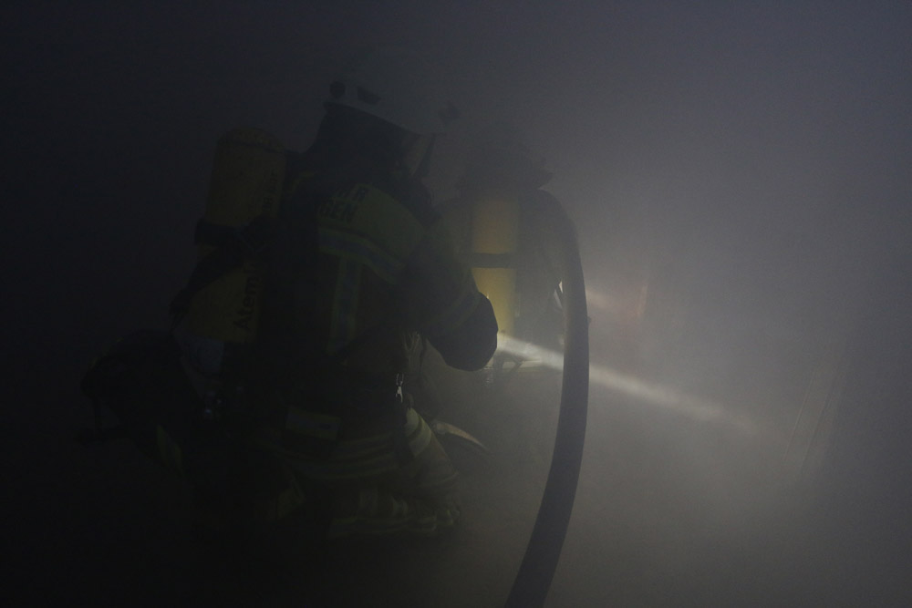 // alleine sechs Trupps unter Atemschutz erkundeten die Lage im Inneren der Halle, Führten eine Menschenrettung (Dummys und Mitarbeiter des Unternehmens) und führten letzten Endes die Brandbekämpfung durch.