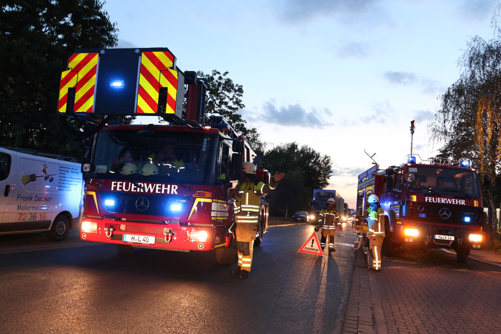 // weitere Einsatzkräfte bauten eine umfassende Wasserversorgung auf. Dafür mussten Schläuche zu Hydranten am Rehkamp verlegt werden. Die Schlauchleitungen führten dabei über die Straße, weshalb die Fahrzeuge einzeln über Schlauchbrücken fahren mussten. Es kam zu leichten Verkehrsbehinderungen.