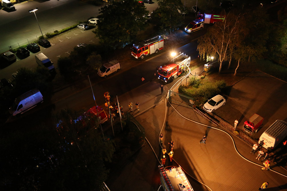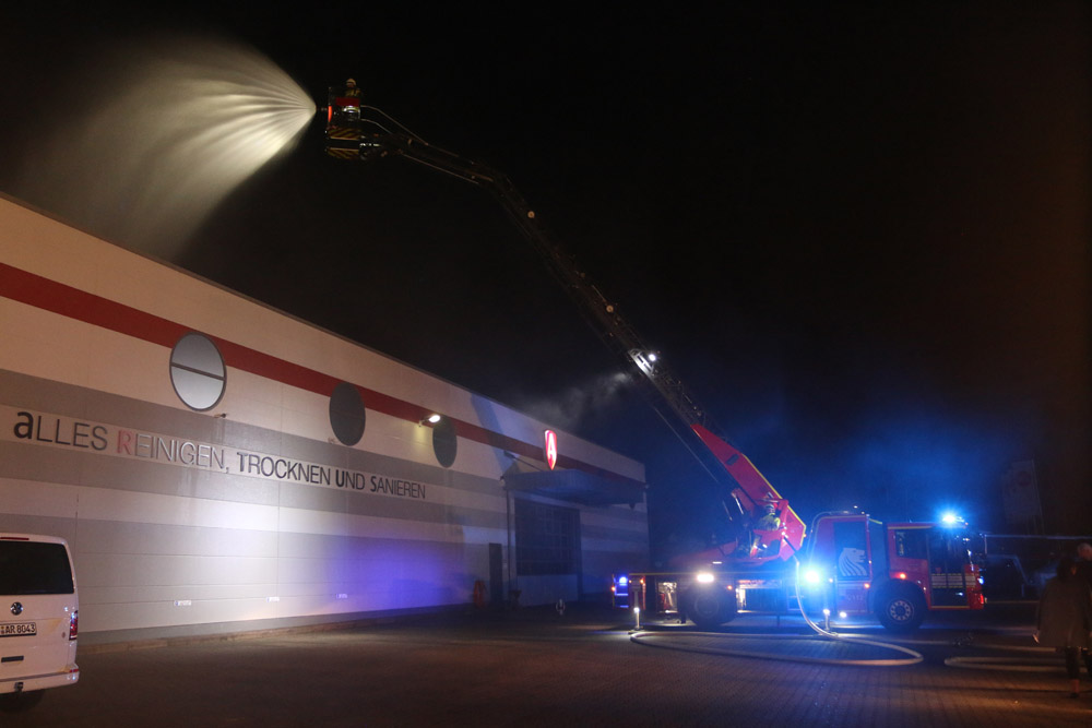 // die Besatzung der Drehleiter rettete zwei Personen vom Lagerhallendach und setze im Anschluss das Wenderohr zur Brandbekämpfung ein.