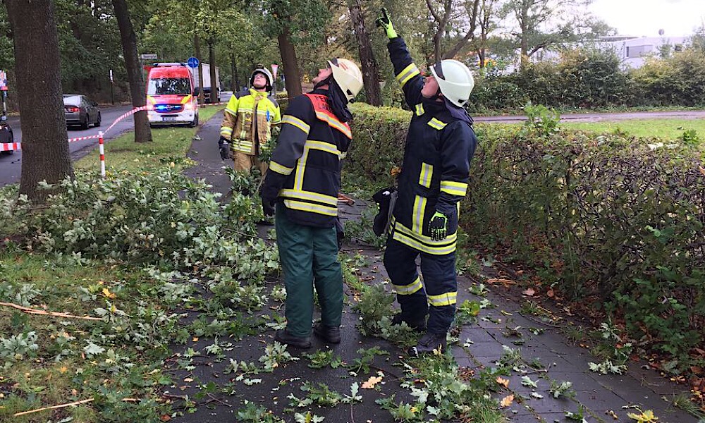 Ast droht auf Straße zu stürzen, händisch aus Baumkrone entfernt.