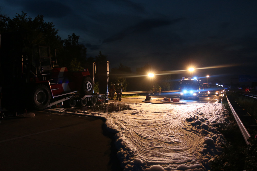 Beim Eintreffen der ersten Einsatzkräfte standen mehrere Zwillingsreifen des Sattelaufliegers in Flammen. Der überbreite Sattelauflieger war mit einem 32t Stapler beladen. Die Flammen waren im Begriff auf die hintere Bereifung des Staplers überzugreifen. Im Einsatzverlauf wurden drei Atemschutztrupps zur Brandbekämpfung eingesetzt. Um 22:00 Uhr wurde die Ortsfeuerwehr Krähenwinkel und gegen 22:15 Uhr ein Groß-Tanklöschfahrzeug der Flughafenfeuerwehr nachalarmiert, um die Löschwasserversorgung sicherzustellen. Insgesamt wurden ca. 9.000l Wasser und 40l Schaummittelkonzentrat zur Brandbekämpfung eingesetzt.