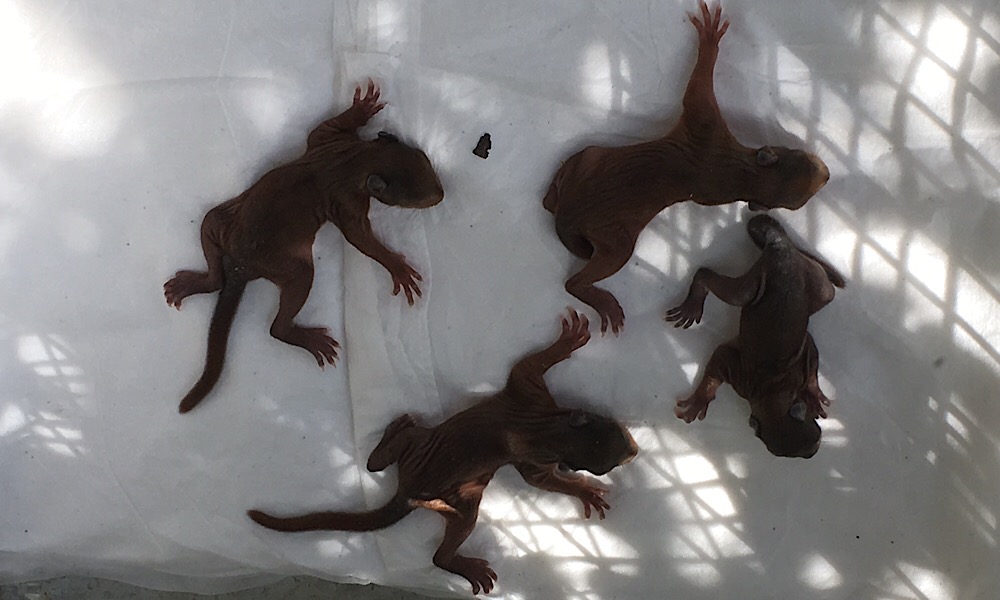 vermutlich aufgrund des böigen Windes sind 4 Eichhörnchenbabys aus dem Nest gefallen -> telefonische Beratung mit einem Tierarzt; Transport in die Tierärztliche Hochschule zur weiteren Aufzucht