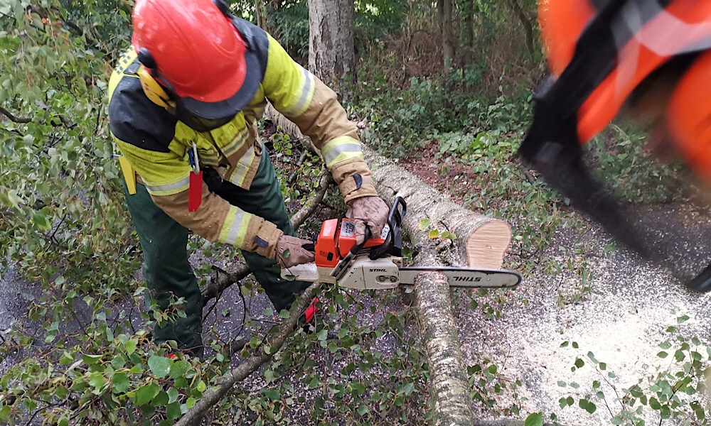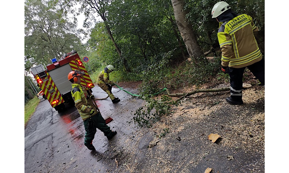 Dieser wurde mittels einer Motorkettensäge zerteilt und von der Fahrbahn geräumt. Einige größere Äste wurden durch den umfallenden Baum in ca. 6m Höhe abgeknickt und stellten eine weitere Gefahr für die öffentliche Sicherheit dar. Die Äste konnten mit Seilen angeschlagen und mit dem Löschfahrzeug herunter gezogen werden. Abschließend wurde die Fahrbahn noch gefegt.