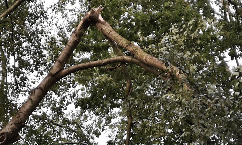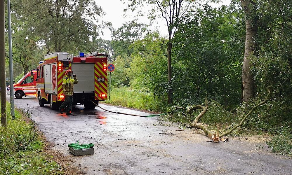 Infolge einer Gewitterfront mit teils kräftigen Sturmböen fiel ein Baum auf die Straße.